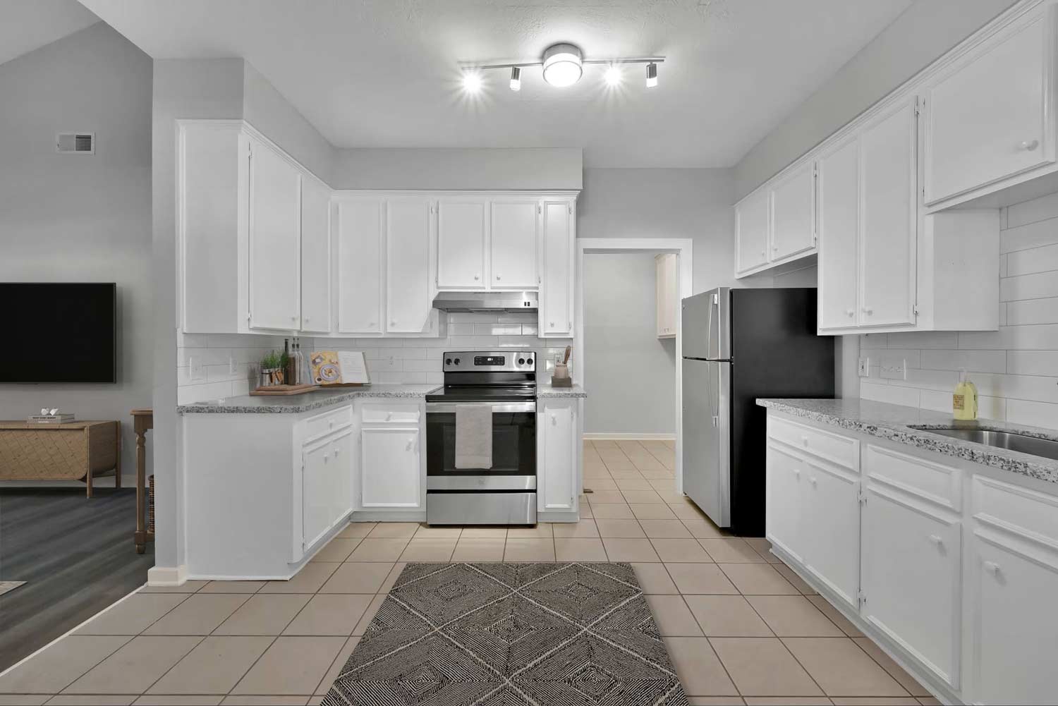 – Modern track lighting in kitchen and dining areas